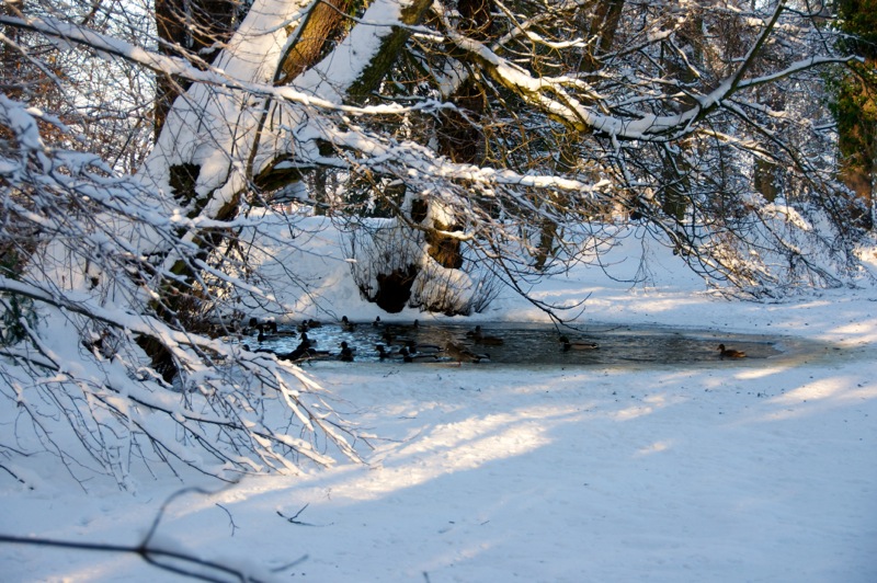- Enten und Schwäne auf dem fast zugefrohrenem Glockenteich im Schlosspark zu Ballenstedt