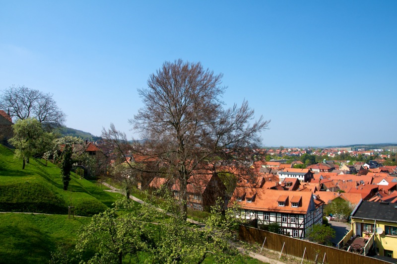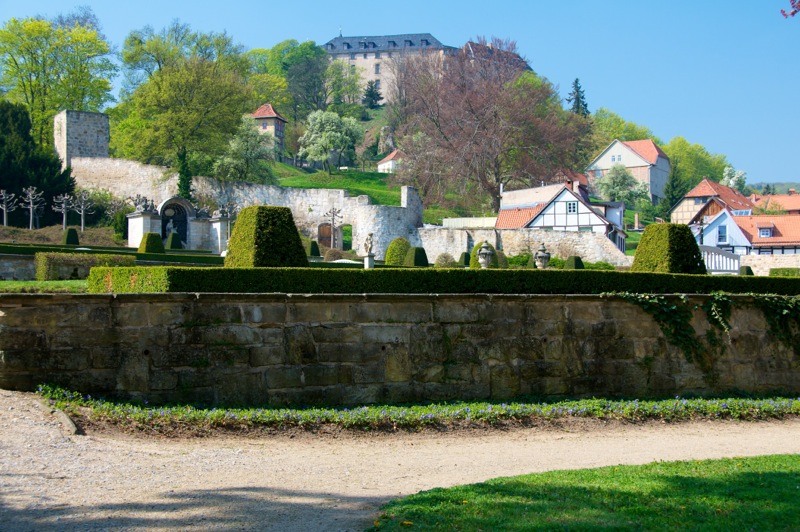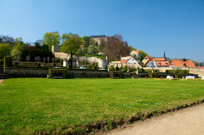 - Blick von barocken Garten auf Blankenburg im Harz.