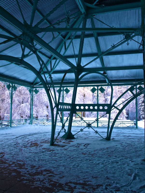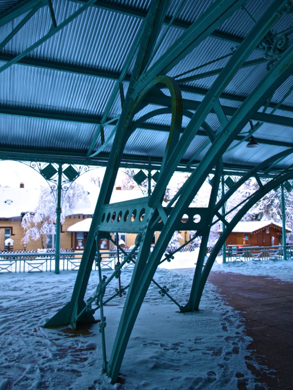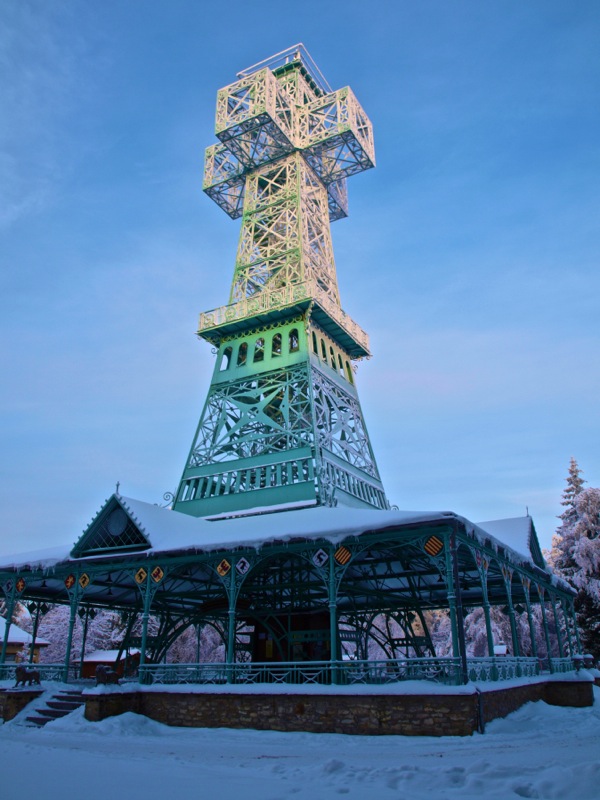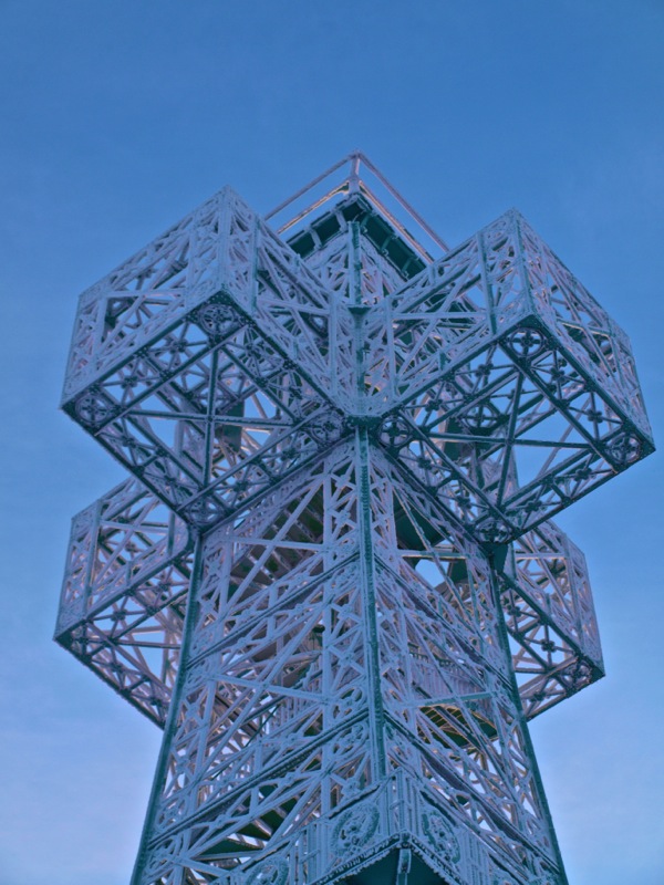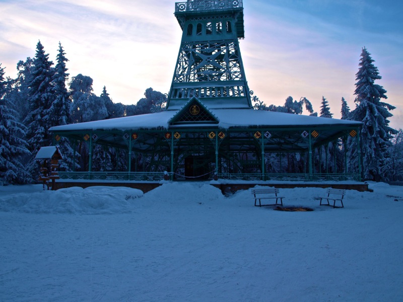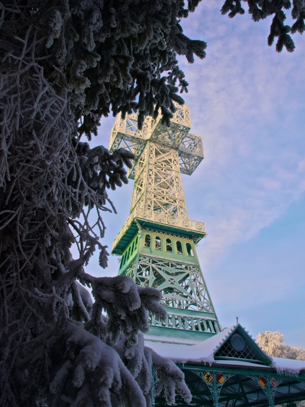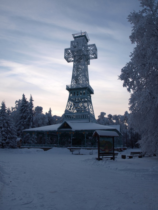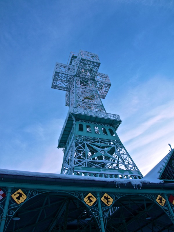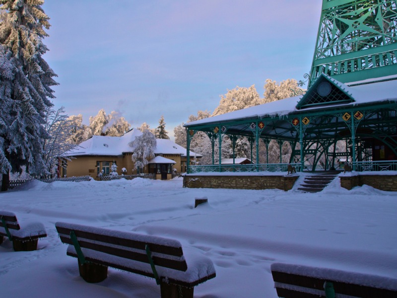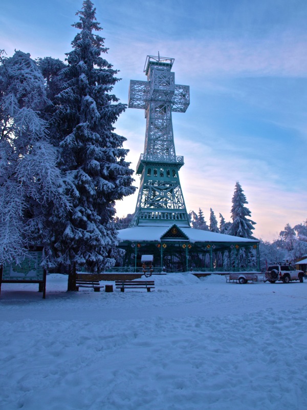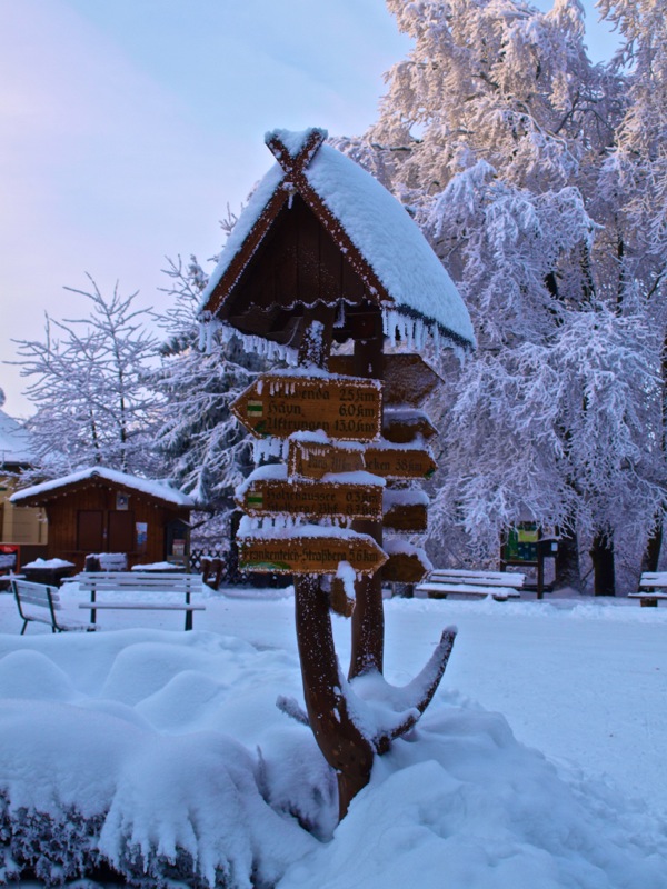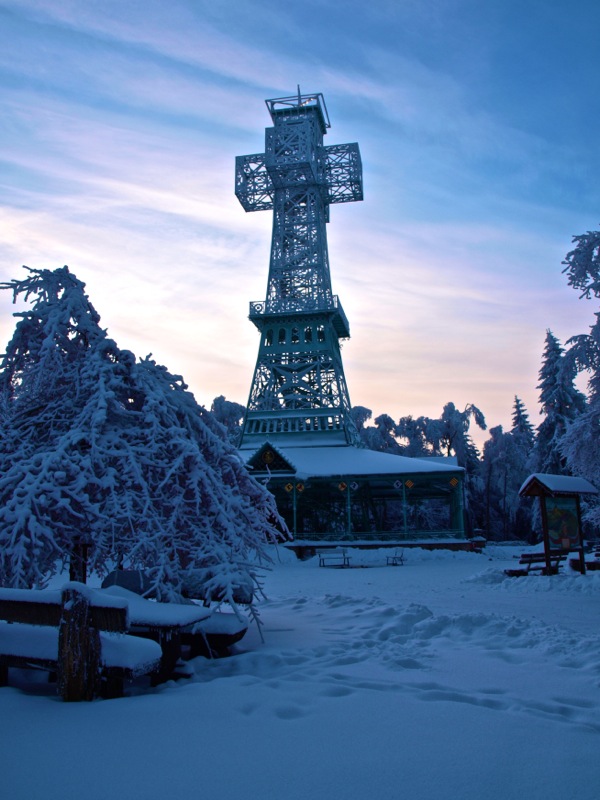 Ein Wintermorgen am Josephskreuz: Der Auerberg bei Stolberg im Harz – der URBERG der frühen Siedler der Harzregion – erhebt sich fast 580 Meter über den Meeresspiegel. An der Stelle des heutigen Josephskreuzes – dem größten eisernen Doppelkreuz der Welt – befanden vorzeiten mehrere Aussichtstürme. 1896 fand die Grundsteinlegung für ein neu zu errichtendes Josephskreuz statt. Vor dem Hintergrund der Pariser Weltausstellung mit ihrem Wahrzeichen Eiffelturm, entwarf der Baurat Otto Beißwänger eine kühne und luftig wirkende Eisenkonstruktion. Die Eisengussteile lieferte die Braunschweiger Dampfkessel- und Gasometerfabrik. In der DDR verfiel das Josephskreuz – trotz seiner Einstufung als Technisches Denkmal – zusehends. 1989 wurde mit der aufwändigen Restaurierung des Kreuzes begonnen. Am 28. August 1990 fand die Einweihung statt. Heute ist das Josephskreuz für jeden zugänglich. Dem schwindelfreien Besucher eröffnet sich von seinen Plateaus ein unvergleichlicher Blick über die Berge und Wälder des Harzes und seines Vorlandes. Am Morgen der Aufnahme dieser Fotos – dem 06.10.2010 – war es wirklich sehr kalt, nämlich Minus 20 Grad Celsius. – Fotos © 2010 by Birk Karsten Ecke mit OLYMPUS E-520.