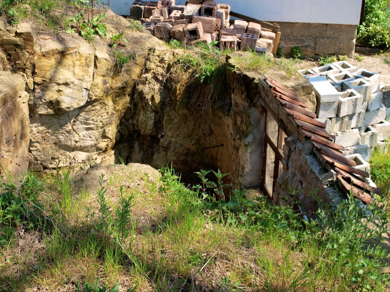 - Bild: Aufgang zur Höhlenwohnung an der Dorfstraße in Langenstein.