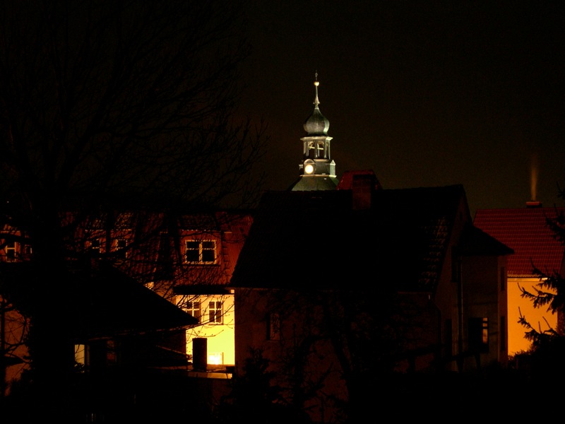 - Hettstedt – Blick vom Jüdenkegel auf die Kirche St. Jakobi bei Nacht.