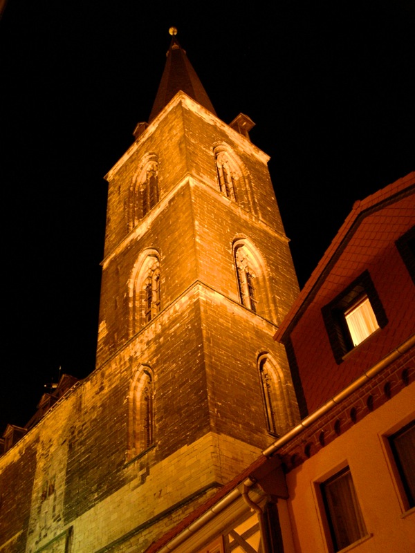 - Aschersleben – An der Kirche St. Stephani bei Nacht.
