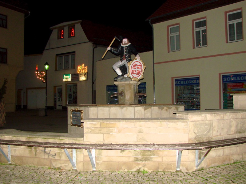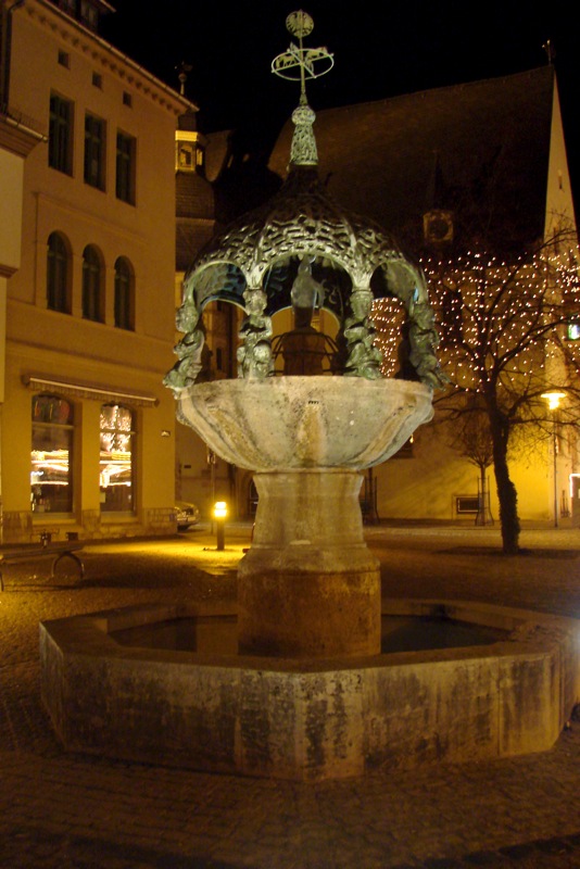 - Mansfeld – Der Lutherbrunnen bei Nacht.