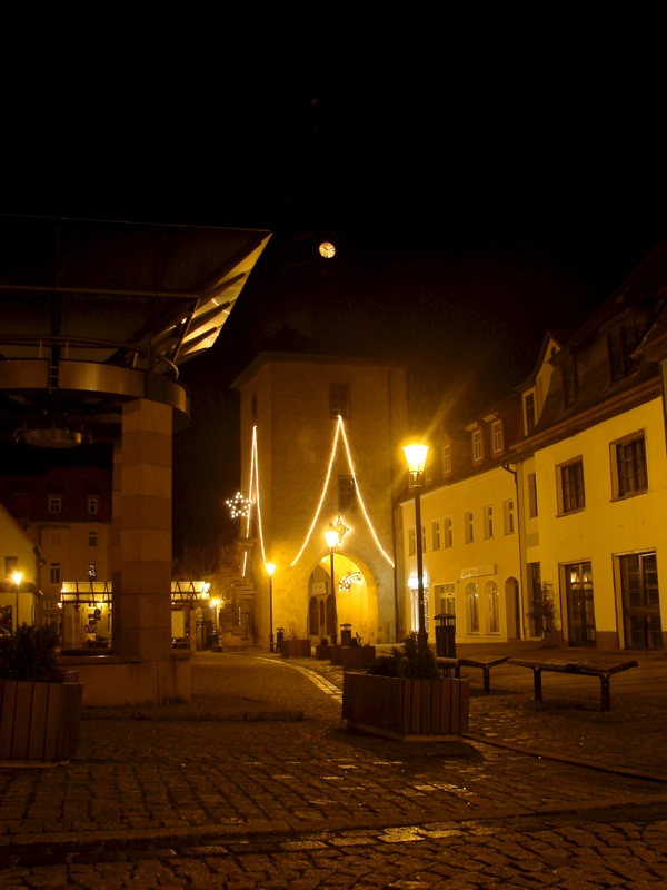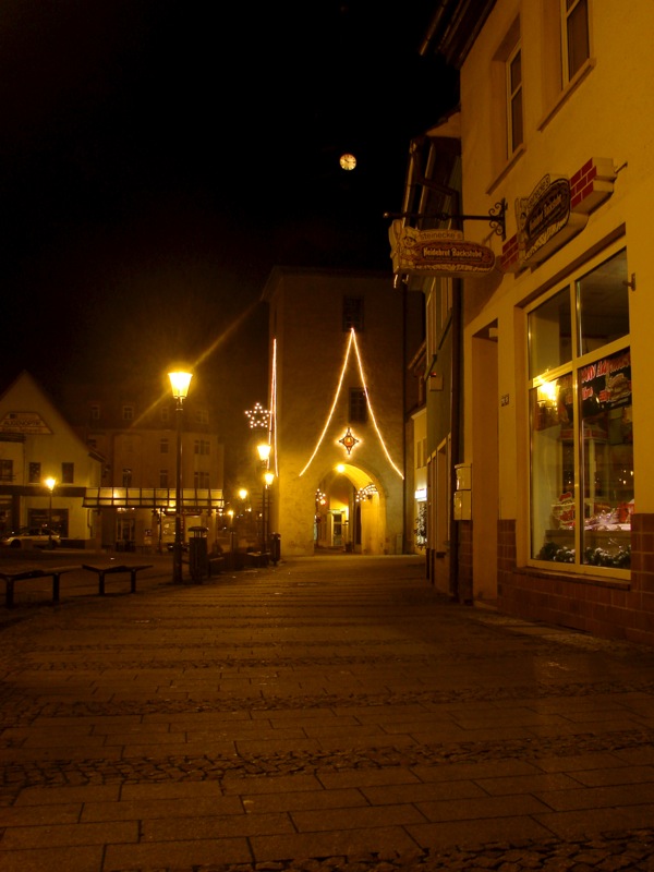 - Hettstedt – Das Saigertor an Weihnachten bei Nacht.