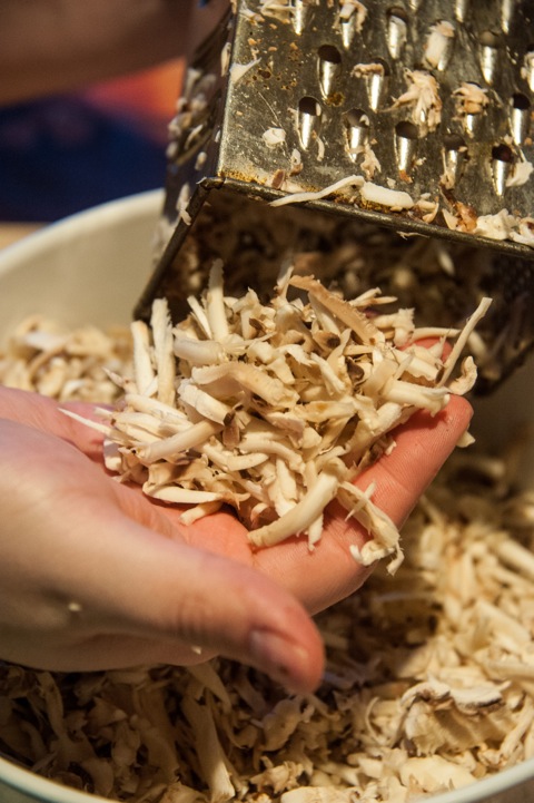 Die etwa 800 g frische Champignongs putzen. Nicht mit Wasser abwaschen, da die Champignons ganz trocken sein müssen. Ein paar Champignons als Dekoration für die Salatherzen zurückbehalten. Dann mit einer Reibe relativ fein reiben. In einer weiten und flachen Pfanne Rapsöl stark erhitzen. Die geschnitzelten Champignons anbraten, bis der Saft weitgehend verkocht ist. Mit Wildgewürz und reichlich Salz würzen. Mit Tomatenmark binden und aus der Pfanne nehmen. Die Farce vollständig auf Raumtemperatur abkühlen lassen.