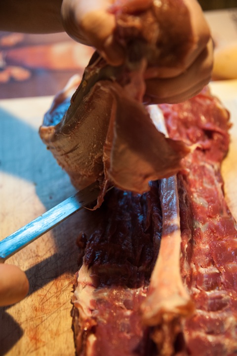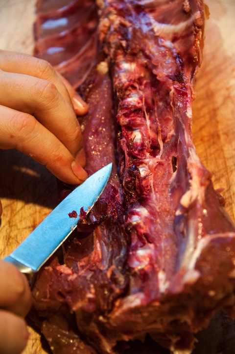 Bild: Aus dem Damwildrücken die beiden Filets mit einem scharfen Messer entlang der Wirbelsäule und der Rippenbögen vorsichtig auslösen.