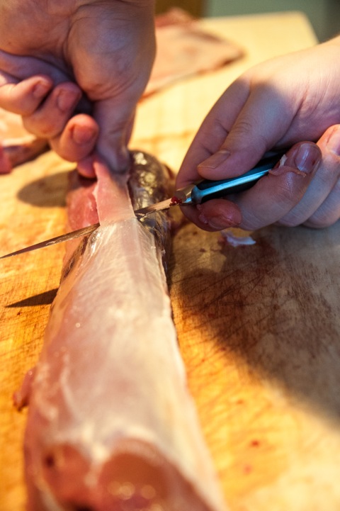 Von den Filets muss unbedingt die Silberhaut komplett entfernt – pariert – werden. Die Silberhaut ist ein starkes Bindegewebe, das beim Kurzbraten zäh wird und sich zusammenzieht.