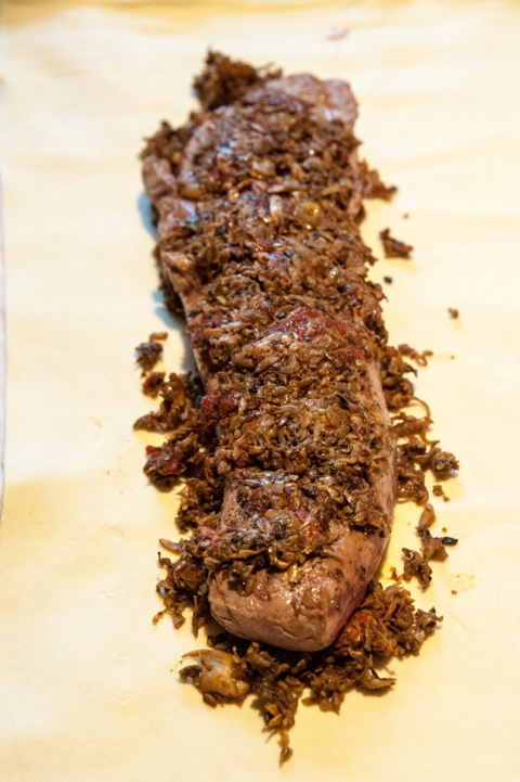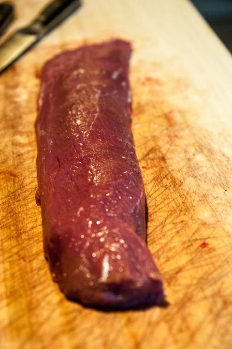 Den Damwildrücken auf ein großes Brett legen. Aus dem Damwildrücken die beiden Filets mit einem scharfen Messer entlang der Wirbelsäule und der Rippenbögen vorsichtig auslösen. Die beiden Filets sind für das Wellington. Dann die beiden Lendenstücke mit einem scharfen Messer auf der Unterseite des Damwildrücken vorsichtig auslösen. Die Lendenstücke brauchen wir für den Salat.