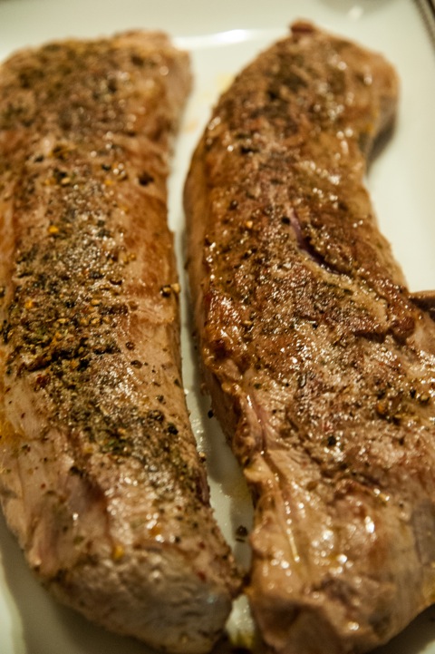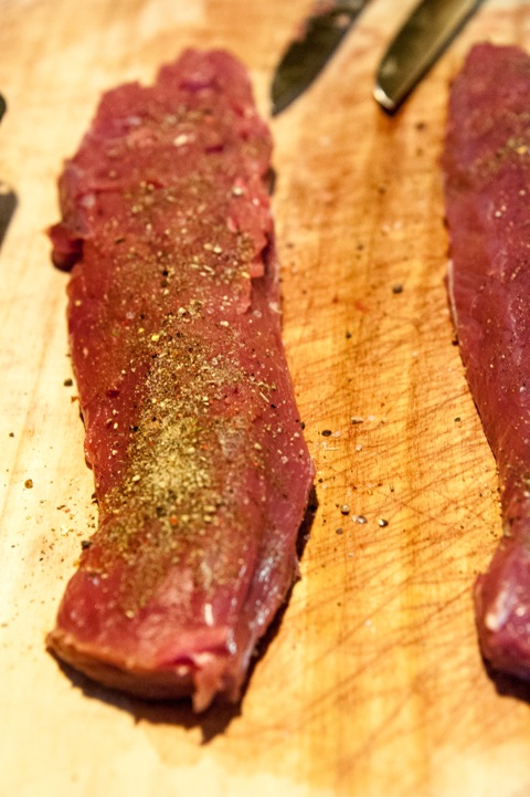 Bild: Die Damwildfilets mit frisch gestoßenem Pfeffer, etwas gestoßener Chilischote, Wildgewürz oder Kräuter der Provence und Salz würzen.