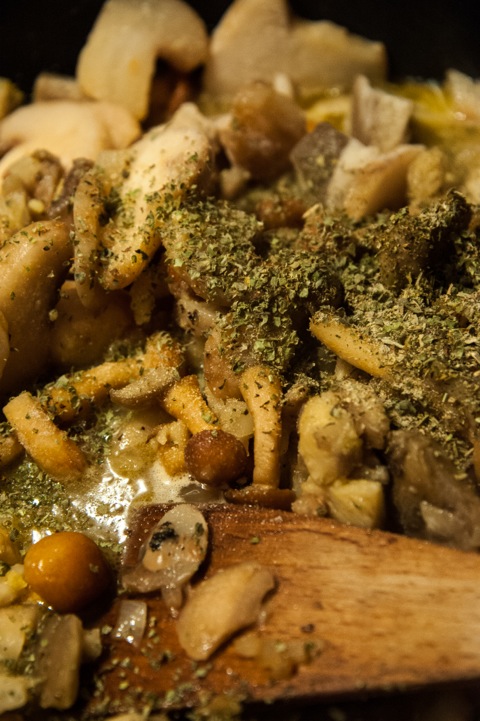 Bild: Die Waldpilze mit Wildgewürz oder Kräutern der Provence, frisch gemahlenem Pfeffer, Salz und etwas Knoblauch würzen.