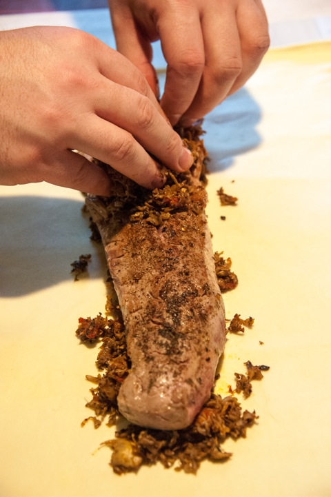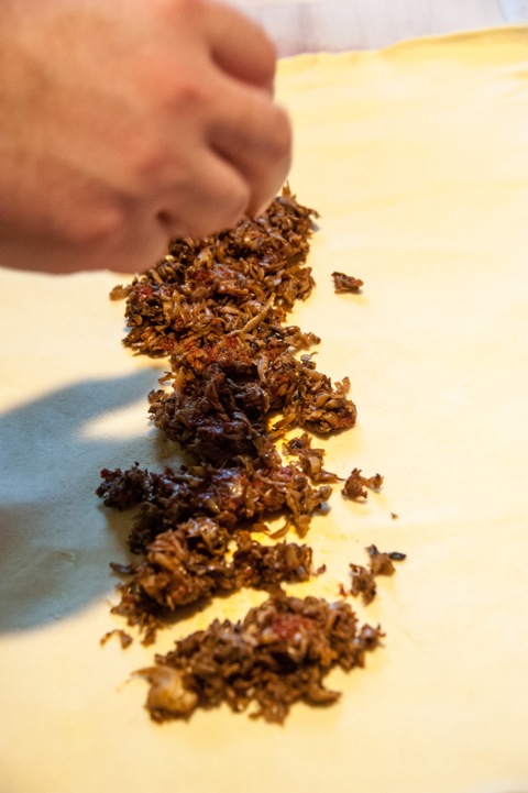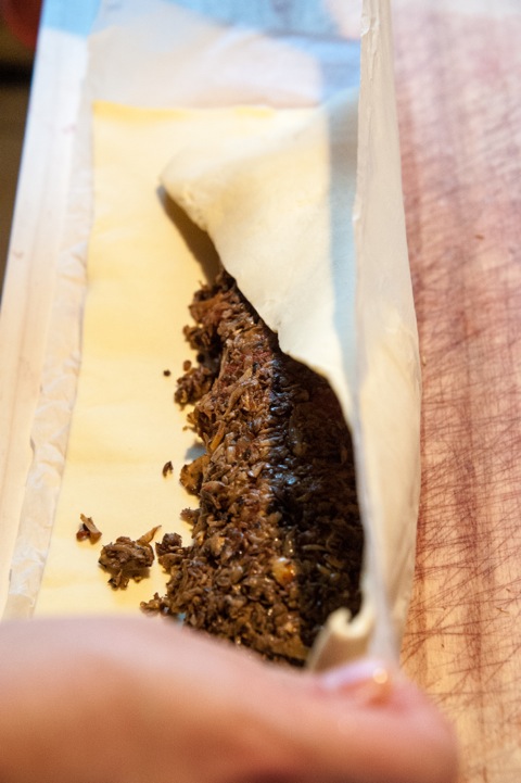 Bild: Einen Teil der abgekühlten Champignonfarce in der Breite der Filets auf dem flach ausgebreiteten Blätterteig verteilen.