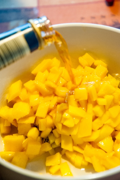 Auch das Dessert lässt sich gut vorher zubereiten. Die vollreife Mango schälen und das Fruchtfleisch rund um den Kern lösen. In feine Würfel schneiden. Die Kiwi ebenfalls schälen und fein würfeln. In eine Schale füllen und den Saft der Früchte dazugeben. Amarettolikör und Rum zugeben und vorsichtig umrühren. Wer Rosinen oder Sultaninen mag, kann auch davon eine Hand voll an die Mango- und Kiwiwürfel geben. Das Dessert bis zum Servieren kalt stellen. Vor dem Auftragen noch einmal vorsichtig umrühren.