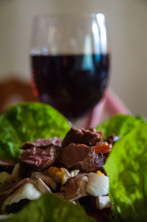 Kurz vor dem Anrichten in heißem Rapsöl die ausgelösten Lenden rundherum kurz und kräftig anbraten. Sie Lenden sollen innen noch rosa sein. Wenige Minuten ruhen lassen und dann schräg tranchieren. Die Tranchen von der Damwildlende auf den Salat legen. Saft von den Lenden darüber gießen. Den Salat kann sich jeder der Tischgäste selber ganz nach Gusto mit frischem Pfeffer, Salz, Kürbiskernöl, Aceto Balsamico und Olivenöl selbst anrichten.