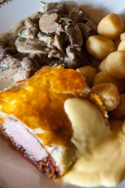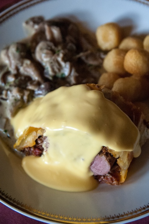 Das Gemüse von den Waldpilzen in ein Schüssel füllen und auftragen. Sauce Hollandaise in eine Sauciere füllen. Den Salat in der Schüssel oder der Platte auftragen. Die beiden Filet Wellington auf ein großes Brett legen und am Tisch mit einem scharfen Messer schräg tranchieren. Jeder kann sich selbst bedienen. Dazu passt ein gehaltvoller Rotwein, je nach Geschmack lieblich oder trocken.