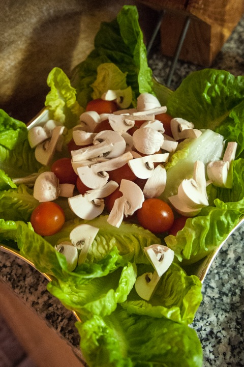 Kurz vor dem Anrichten in heißem Rapsöl die ausgelösten Lenden rundherum kurz und kräftig anbraten. Sie Lenden sollen innen noch rosa sein. Wenige Minuten ruhen lassen und dann schräg tranchieren. Die Tranchen von der Damwildlende auf den Salat legen. Saft von den Lenden darüber gießen. Den Salat kann sich jeder der Tischgäste selber ganz nach Gusto mit frischem Pfeffer, Salz, Kürbiskernöl, Aceto Balsamico und Olivenöl selbst anrichten.