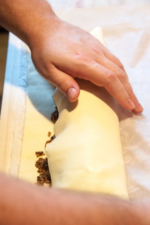 Bild: Einen Teil der abgekühlten Champignonfarce in der Breite der Filets auf dem flach ausgebreiteten Blätterteig verteilen.