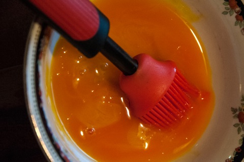 Diese Arbeitsschritte können Sie problemlos am Abend vorher vorbereiten. Die Blätterteigtaschen in diesem Fall kalt stellen. Zum Fertigstellen des Filet Wellington den Backofen auf 170 ° Grad Celsius vorheizen. Die Blätterteigrollen vorsichtig und ohne sie zu beschädigen auf ein mit Backpapier ausgelegtes Backblech legen. Zwei Eier trennen. Die Blätterteigrollen großzügig mit dem Eigelb bestreichen.
