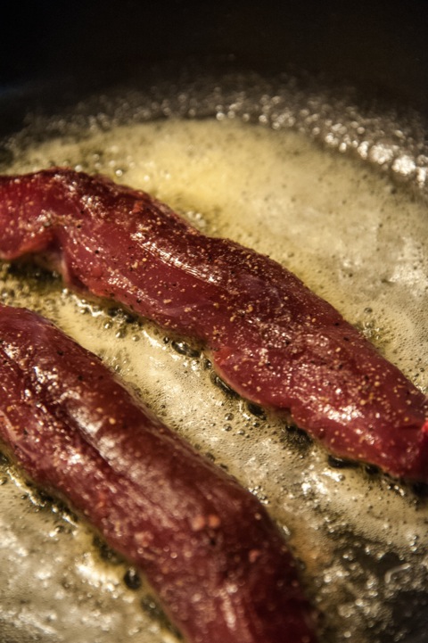 Von den Filets muss unbedingt die Silberhaut komplett entfernt – pariert – werden. Die Silberhaut ist ein starkes Bindegewebe, das beim Kurzbraten zäh wird und sich zusammenzieht.